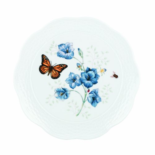 Lenox Butterfly Meadow Basket 9-Inch Accent Plate. This Butterfly Meadow plate is graced with a monarch butterfly, a bumblebee and a trio of blue flowers. A bas-relief wicker basket motif encircles the plate.