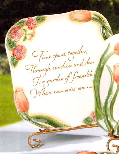 Grasslands Road garden tableware features this set of four peach tulip accent plates. Set includes 4 styles each with inspirational upbeat message. Dishwasher and microwave safe.