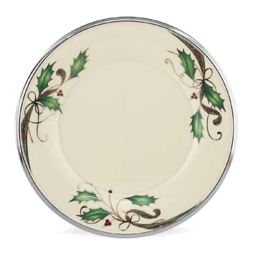 A graceful and festive addition to Holiday Nouveau dinnerware, this accent plate bears three Holiday motifs on its border. The rim of precious platinum gleams against the ivory bone china. Matching accent mug also available.