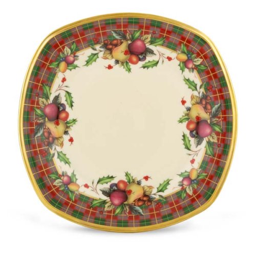 A tri-colored plaid border makes a bold backdrop to the design of seasonal fruits encircling this plate. Generously edged in gold, the plate will add a burst of color to your holiday table or buffet.