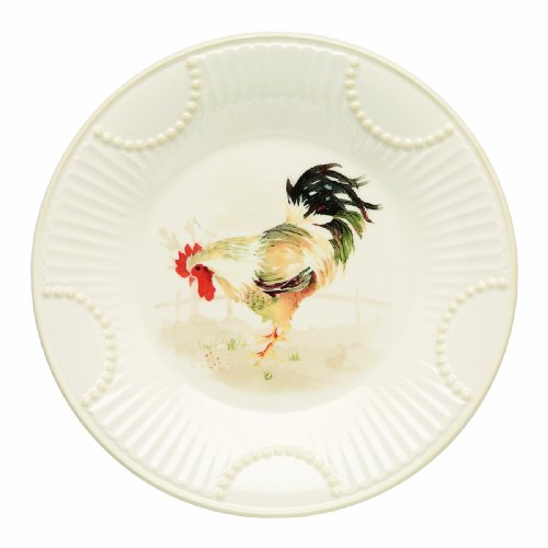 Butler's Pantry Buffet Golden Rooster Accent Plate by Lenox. With feathers the color of a golden sunrise, a proud rooster graces the center of this Butler's Pantry accent plate. In the background is a muted barnyard scene. The rim bears the familiar Butler's Pantry Buffet fluting and raised dots.