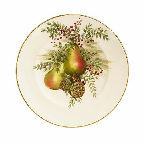 A pair of pears, along with a pair of pinecones, provides a lovely focal point for the design decorating this attractive plate. The gold-banded china is crafted using Lenox MicrosafeƖ technology, meaning it's safe to use in both the microwave and dishwasher.