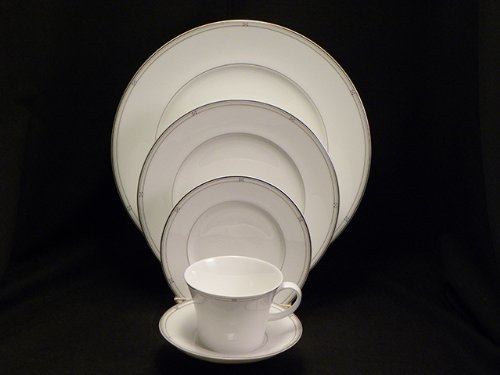 JAZ by Nikko Ceramics is an elegant tailored art-deco formal dinnerware pattern on white bone china. Each piece has a narrow decoration with an irridescent band highlighted with small cross and square boxes. All pieces are trimmed in elegant platinum.