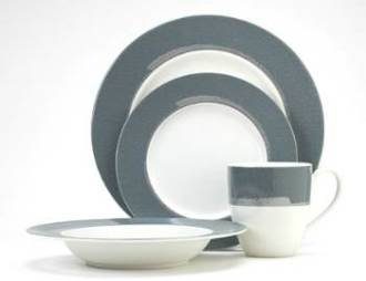 The muted tones and stippled effect of the border are energized by an irregular silvery streak that circles the inner boundary. White stoneware forms the basis for this contemporary and unique design.